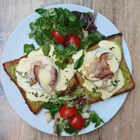 2 jaja na oko, avokado namaz, slanina, čedar preliv,ćoška salata,tost hleb