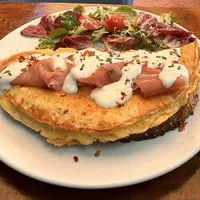 omlet od 3 jaja,hleb, pršuta, parmezan sos,ćoška salata